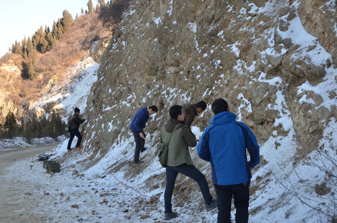 驪山梁上積雪未消,隊員們冒著零下3℃的低溫認真的測量地質(zhì)剖面。他們分工明確,有人拉皮尺,有人定巖性,有人管記錄。寒風(fēng)吹過參賽隊員的臉頰,他們毫無知覺,一心一意專注于比賽之中。擂臺之上比速度,實戰(zhàn)之中看技能,這樣的比賽場面,也展示著地質(zhì)隊員精益求精的工作態(tài)度。
