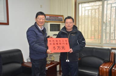 春節(jié)將至,暖意濃濃。各級(jí)領(lǐng)導(dǎo)心系困難職工。1月24日下午,陜西省總工會(huì)黨組成員、副主席張永樂(lè)一行5人,深入我公司開(kāi)展送溫暖活動(dòng)。集團(tuán)公司黨委委員、副總經(jīng)理、工會(huì)主席白林科,工會(huì)常務(wù)副主席張漢軍等陪同慰問(wèn)。張永樂(lè)詳細(xì)了解了公司生產(chǎn)經(jīng)營(yíng)情況與發(fā)展中面臨的困難與問(wèn)題,以及“春節(jié)”前我公司幫扶服務(wù)工作的開(kāi)展情況。張永樂(lè)副主席充分肯定了我公司的各項(xiàng)工作,代表省總向公司廣大職工致以新春的問(wèn)候!努力把以習(xí)近平同志為核心的黨中央對(duì)廣大職工群眾的關(guān)心關(guān)懷送到職工群眾的心坎上。座談會(huì)后,張永樂(lè)一行先后到因病致困職工王玉霞和西安市勞動(dòng)模范董紅毅家中進(jìn)行了走訪,仔細(xì)了解了他們的生活情況,并送上慰問(wèn)金和慰問(wèn)品。