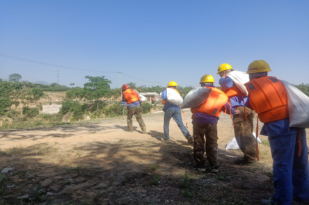 當(dāng)日上午8點(diǎn)整,秦太選廠(chǎng)組織相關(guān)參與人員在辦公樓前進(jìn)行集中,并對(duì)本次演習(xí)簡(jiǎn)要講解。本次演習(xí)假設(shè)場(chǎng)景為連續(xù)強(qiáng)降雨,導(dǎo)致有洪水漫入庫(kù)內(nèi)并發(fā)現(xiàn)排洪渠內(nèi)有樹(shù)木雜草,庫(kù)內(nèi)水位不斷上升已接近警戒線(xiàn),存在漫壩危險(xiǎn),需啟動(dòng)應(yīng)急預(yù)案。演習(xí)地點(diǎn)為寺溝尾礦庫(kù)。演習(xí)內(nèi)容為監(jiān)測(cè)人員發(fā)現(xiàn)險(xiǎn)情及時(shí)上報(bào),興地公司立即啟動(dòng)《尾礦庫(kù)生產(chǎn)安全專(zhuān)項(xiàng)應(yīng)急預(yù)案》,各單位、部門(mén)應(yīng)急救援隊(duì)員迅速集結(jié)、緊急增援。增援隊(duì)伍到達(dá)現(xiàn)場(chǎng)后,應(yīng)急搶險(xiǎn)分隊(duì)、警戒疏散組、物資保障組、技術(shù)支持組和醫(yī)療防護(hù)組分別按照各自的職能開(kāi)展相應(yīng)工作。搶險(xiǎn)工作主要分為尾礦庫(kù)壩面人工堆積防洪壩,馬道排洪渠清除雜物,尾礦庫(kù)下游村莊村民疏散。