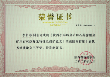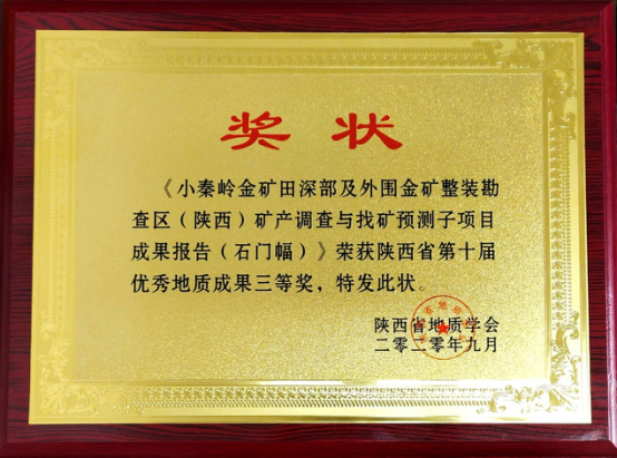 由我公司地調(diào)所編制完成的“小秦嶺金礦田深部及外圍金礦整裝勘查區(qū)(陜西)礦產(chǎn)調(diào)查找礦預測子項目(石門幅)成果報告”獲陜西省第十屆優(yōu)秀地質(zhì)成果三等獎;張歡歡同志撰寫的“陜西小秦嶺金礦床三位一體勘查區(qū)找礦預測地質(zhì)模型及找礦意義”獲優(yōu)秀地質(zhì)論文一等獎;李長壽同志撰寫的“陜西小秦嶺金礦田石英脈型金礦床石英熱釋光特征及其找礦意義”獲優(yōu)秀地質(zhì)論文三等獎。